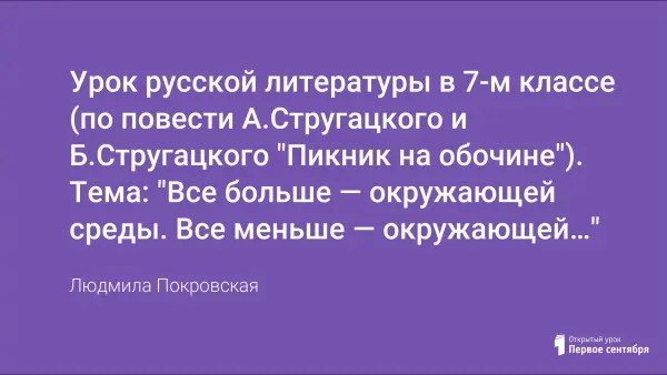 Проблеме экологического воспитания учащихся в современном образовательном процессе придается большое значение. Учителя-словесники вносят ощутимый вклад в дело реализации данной проблемы. Предлагается урок по повести братьев Стругацких "Пикник на обочине", в основе которого – метод проекта: создание обложки книги.