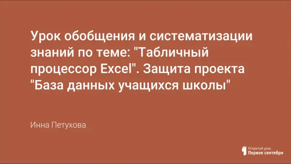 В данной работе представлен урок обобщения и систематизации знаний по теме "Электронный процессор Excel". После изучения возможностей электронных таблиц учащиеся выполнили проект по созданию базы данных учащихся школы. Данный проект является практико-ориентированным. Практическая значимость и качество выполнения данного проекта высоко оценены администрацией школы.