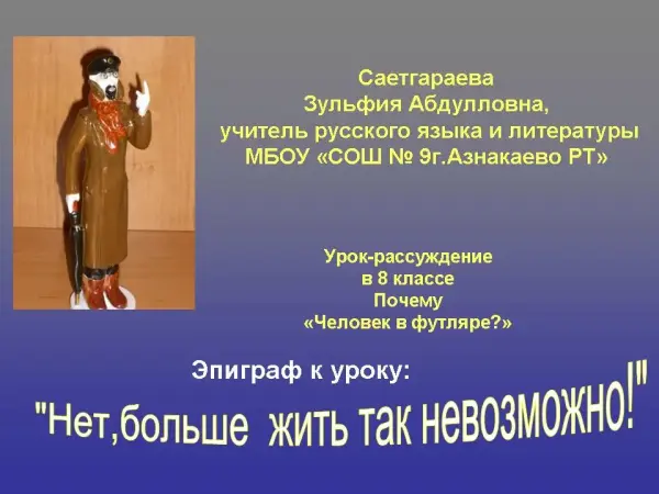 Урок расширяет знания учащихся о жизни и творчестве А.П. Чехова, доказывает, что в образе Беликова писатель собирает все свои наблюдения над реакционным порядком и обобщает их; дает представление о рассказах 90-х годов, помогает понять за фигурой Беликова беликовщину – типичное явление общественной жизни 80‒90-х годов XIX века. В процессе урока-рассуждения доказываются по алгоритму или комментируются творческие работы и мини-исследования по тексту.