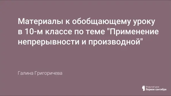 Представлен материал к обобщающему уроку в 10-м классе по теме "Применение непрерывности и производной". Материал предполагает повторение теории и методов решения типичных примеров и задач по основным разделам темы "Применение непрерывности", "Касательная к графику функции", "Приближенные вычисления", "Производная в физике и технике" с помощью средств PowerPoint.