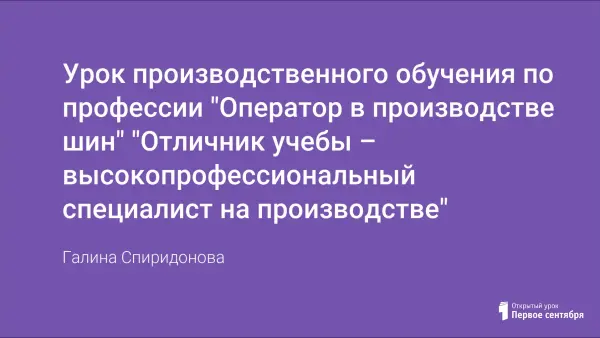 Данный урок производственного обучения является обобщающим в разделе программы "Обучение сборке покрышек с радиальным расположением нитей корда в каркасе". Это урок – соревнование, ролевая игра, творчество, рассчитанный на расширение кругозора, познавательной деятельности обучающихся, формирование знаний, навыков, необходимых в практической деятельности на производстве.