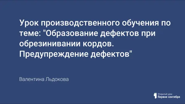 Данный урок поводится в группе контролеров шинного производства производственного предприятия. Цель урока – развитие у учащихся умений и навыков по определению дефектов обрезиненного корда, умений устанавливать причины возникновения дефектов. В ходе урока воспитывается чувство ответственности за выполняемую работу, формируются нормы и правила поведения на рабочем месте.