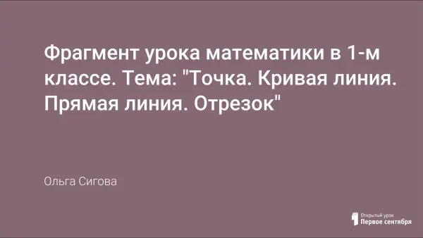 Цель урока математики в 1-м классе: формирование понятий "точка", "кривая линия", "прямая линия", "отрезок". В ходе практической работы создаётся наглядный образ кривой линии, прямой линии, отрезка. В ходе обсуждения созданных моделей устанавливаются их свойства. Созданные образы геометрических фигур сопоставляются с предложенными в презентации-сказке.