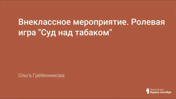 После изучения темы "Сложные эфиры" наступает очередь ролевой игры "Суд над табаком". Игра не только развивает познавательный интерес учащихся к химии, но и позволяет повторить материал, изученный ранее. Кроме того, в системе воспитательной работы школы здоровый образ жизни занимает одно из главных мест.