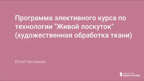 В материале представлена программа элективного курса по технологии (обслуживающий труд) "Живой лоскуток" для учащихся 5-х классов в объеме 34 учебных часа. Целью программы является ознакомление и дополнение знаний учащихся по разделу "Рукоделие. Лоскутная пластика" образовательной области "Технология".
