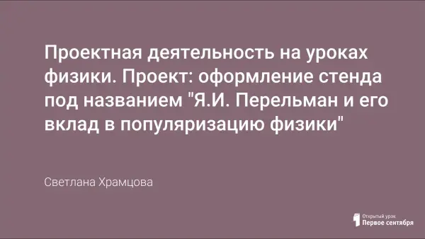 Приведен пример паспорта проекта: оформление стенда под названием "Я.И. Перельман и его вклад в популяризацию физики". В этом проекте были охвачены все темы, изученные в 8-м классе: тепловые явления, изменения агрегатных состояний вещества, электрические , магнитные и световые явления.