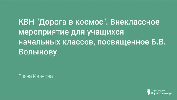 Внеклассное мероприятие для учащихся начальных классов состоит из двух частей: знакомства с биографией своего земляка Б.В. Волынова и КВН. Предложенный сценарий развивает память, логическое мышление, сообразительность, чувство товарищества и взаимопомощи. Дети заранее делятся на две команды, выбирают название, эмблему, рисуют картинки, читают литературу о космосе и космонавтах. В ходе подготовки были проведены экскурсии: в городской музей, к обелиску Б.В. Волынова, в школу №1, где учился Б.В. Волынов и где находится музей, посвященный ему.