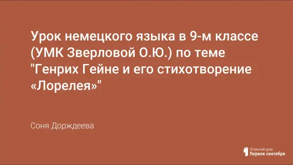 На этом уроке учащиеся знакомятся с биографией Г.Гейне и его стихотворением "Лорелея". Учатся анализировать стихотворение, сравнивают переводы стихотворения. Предусмотрены задания для парной работы, групповой, что обеспечивает развитие всех видов речевой деятельности. Урок способствует развитию речемыслительной деятельности. Используется презентация Power Point, что позволяет повысить интерес к изучаемому языку.