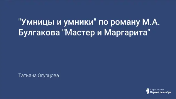Обобщающий урок построен в форме игры «Умницы и умники». Школьники выступают в роли Геллы, Берлиоза, Понтия Пилата, Азазелло, Маргариты, Ивана Бездомного, Иешуа Га-Ноцри, Мастера, Бегемота, Левия Матвея, Коровьева и Воланда.
