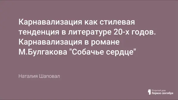 Статья, посвященная исследованию стилевого приема карнавализации в русской литературе на примере творчества М.Булгакова (повесть «Собачье сердце»). Изучается язык символических конкретно-чувственных форм: от больших и массовых действий, до отдельных карнавальных жестов.