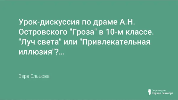 Урок-дискуссия по драме А.Н. Островского «Гроза» в 10-м классе. Урок строится как обобщение изученного материала в форме дискуссии. Методом сопоставления разных трактовок образа Катерины в русской литературной критике 1860-х годов учащиеся приходят к собственным оценкам этой героини, развивают критическое мышление и умение аргументированно доказывать свою точку зрения, привлекая текстовый материал.