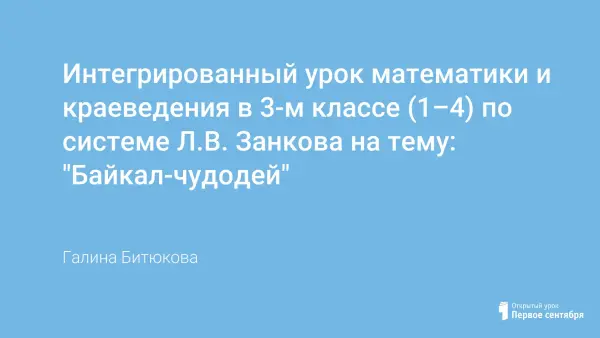 Вашему вниманию представляется интегрированный урок в 3-м классе по теме "Байкал-чудодей", как один из вариантов интегративного подхода на стыке математики и краеведения. Когда мы говорим о природе, то в нашем сознании сразу возникают различные картины: море, лес, берег озера. Многие утверждают, что математика - это сухие цифры, формулы и непонятные уравнения. На уроке я хотела, чтобы ребята оценили красоту и уникальность природы озера Байкал через величие математики, ощутили силу ее эмоционального воздействия через решение интересных задач, уравнений и примеров.