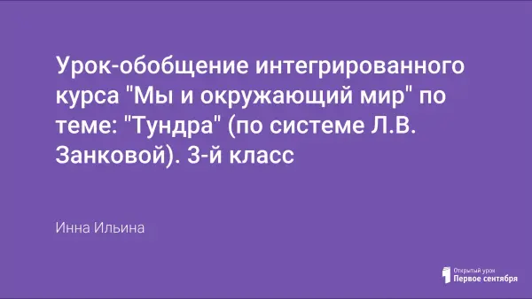 Урок-обобщение в начальной школе интегрированного курса "Мы и окружающий мир" с целью систематизации знаний об особенностях природы тундры. Урок проводится в форме научной коференции, где ученики работают в малых группах: географы, ботаники, зоологи, социологи, экологи. Таким образом ребята учатся вместе достигать результатов, оценивать собственную работу и работу своих товарищей, уважать мнение каждого; воспитываются культура общения, умение слушать друг друга.