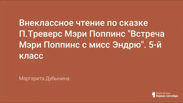 Внеклассное чтение книги П. Треверс «Мэри Поппинс» в 5-м классе позволяет сопоставить разные образы воспитателей детей с помощью театрального искусства, сравнивая художественное произведение и кинофильм. Цель: развитие у учащихся воображения, фантазии, веры в чудо; воспитание умения будни превращать в праздники.