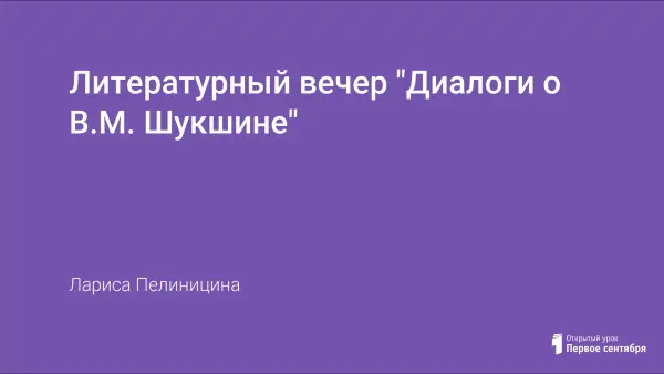 На литературном вечере идет спор о тех вопросах, которые поставил В.М. Шукшин и решать которые завещал нам. Речь идет об уроках В.М. Шукшина, о способе жить в искусстве, о позиции художника. На вечере прозвучат воспоминания о писателе, его письма, отрывки из статей, стихи и песни.