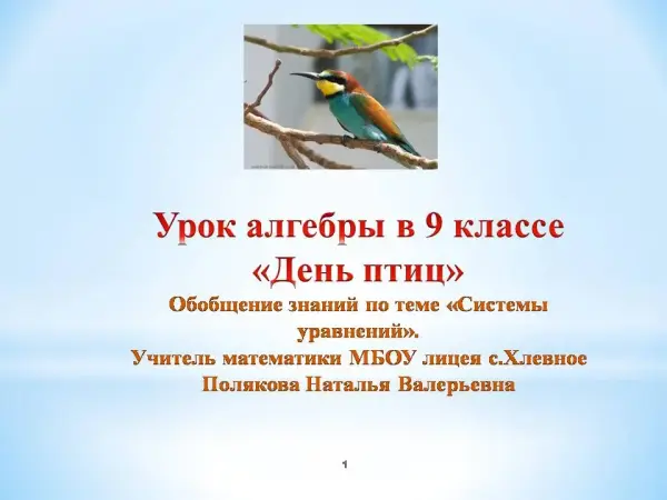 Урок призван повторить понятия: «уравнение с двумя неизвестными», «решение уравнения с двумя неизвестными», «система уравнений с двумя неизвестными», «решение системы уравнений с двумя неизвестными», «способы решения систем»; закрепить умение решать системы уравнений; развивать умение проверять свое решение, выбирать оптимальный способ решения, воспитывать бережное отношение к природе, в частности, к птицам; акцентировать внимание на птицах, проживающих в нашей местности.