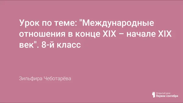 В наше неспокойное время именно учитель истории несёт огромную ответственность за формирование у школьников пренебрежительного отношения к войнам любого характера – локального, мирового. Он должен способствовать становлению у будущего поколения ценностных ориентиров на мир без войн и насилия, на мирные способы урегулирования международных споров и неприятие войн как средства их решения; ориентировать школьников на демократические принципы в межгосударственных отношениях и мир между народами как ценность планетарного масштаба. Цель моего урока выявить и охарактеризовать причины усиления международной напряжённости в конце XIX – начале XX века, донести до сознания учащихся мысль, что нет "малых войн" – каждая война антигуманна и несёт угрозу человечеству.
