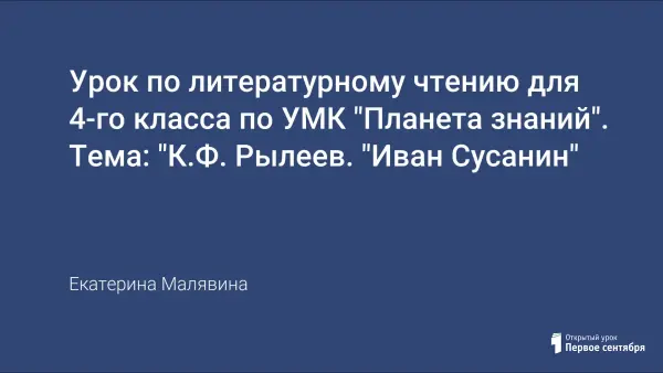 Тема «К.Ф. Рылеев. «Иван Сусанин» входит в раздел «О прошлом Родины», изучается 2 урока. Цели и задачи урока – вспомнить о событиях начала XVII века, определять элементы композиции и их роль в создании эмоционально-смыслового содержания произведения, обогатить словарный запас учащихся, развитие умения читать художественный текст по ролям.