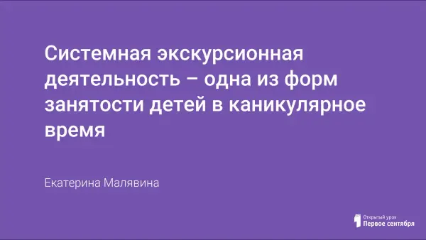 Каникулы – это время, чтобы поиграть с друзьями, выспаться и, конечно же, соскучиться по школе. Задача педагогов и воспитателей – сделать это время для ребят интересным и незабываемым. Наиболее распространенная форма занятости в каникулярное время – это экскурсионная деятельность, которая способствует воспитанию и развитию качеств личности, отвечающих требованиям информационного общества, задачам построения российского гражданского общества на основе принципов толерантности.