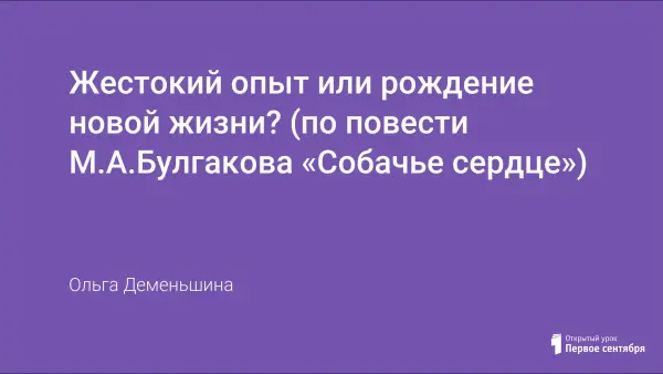 Завершая чтение и размышления над повестью «Собачье сердце», мы постараемся прийти к выводам о философской, социальной и нравственной проблематике этого произведения, обогатим свои представления о сатире и сатирических приёмах изображения и традиционно понаблюдаем над словом в художественном тексте. В ходе урока, размышляя над сложным нравственным вопросом, где проходит граница вседозволенности Человека-Творца, несущего ответственность за поступки, скажем об эксперименте профессора Преображенского, что это было ««Жестокий опыт или рождение новой жизни?»