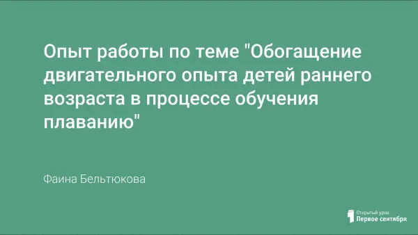 Сущность работы заключается в приобщении детей раннего возраста к движениям в воде и накоплении двигательного опыта через разные типы занятий, игровые приемы и методы, создание предметно-развивающей среды. Развивающее обучение малышей плаванию способствует воспитанию гармонически развитой личности.