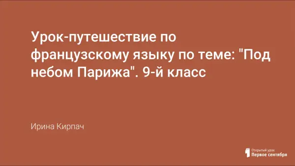 Урок французского языка "Под небом Парижа" проводится в виде экскурсии. Он направлен на формирование представлений учащихся о культуре Франции, на обобщение лингвострановедческого материала по теме, на развитие творческих способностей учащихся, самостоятельности, на совершенствование умений и навыков практического владения французским языком по данной теме (аудирование, говорение, чтение).