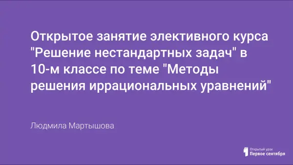 Открытое занятие элективного курса для 10-го класса. Проводится в форме семинара, где работают группы по 5—6 человек. Цель: рассмотреть и проанализировать различные методы решения иррациональных уравнений.