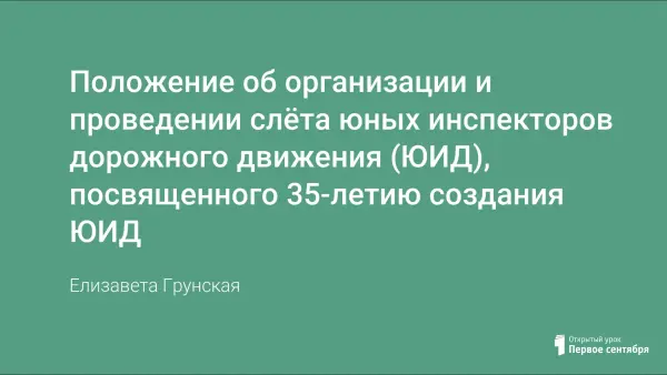 Положение об организации и проведении в МОУ СОШ «Загорские дали» Слета юных инспекторов дорожного движения, посвященного 35-летию создания отрядов ЮИД. Задачи слета: профилактика детского травматизма, пропаганда правил дорожного движения среди детей и воспитание у них практических навыков грамотного поведения на дорогах.