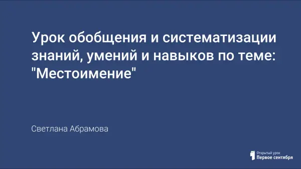 Урок русского языка для учащихся 3-х классов ставит своей целью обобщение и систематизацию знаний, умений и навыков по теме "Местоимение". На уроке идет отработка орфографических навыков, активизируются все познавательные процессы. Урок интегрирован – тексты, включенные в урок, связаны с геометрией. Использовано около 10 различных педагогических приемов. На уроке используются как фронтальная, так и групповая формы работы, работа в парах. Приложен самоанализ урока с указанием некоторых трудностей в его проведении.
