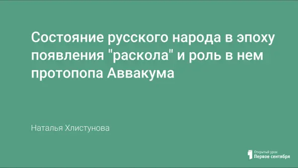 К XVII веку Московское государство воспитало в себе взгляд, отождествлявший национальность с религией. Народ представлялся самому себе обладателем высшей религиозной истины и растил в своей среде национально-религиозную нетерпимость. Выражением этого процесса и стал церковный раскол середины XVII века, который явился результатом церковной реформы патриарха Никона. Аввакум становится активным противником Никона и одним из основоположников старообрядческого движения.