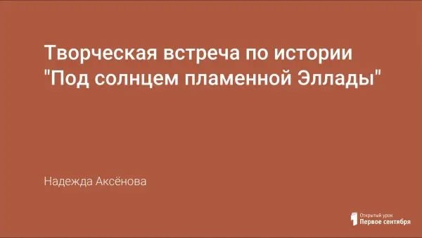 Во внеклассной работе заложены большие возможности формирования интереса к предмету "История". Творческая встреча "Под солнцем пламенной Эллады" нацеливает учащихся на углублённое изучение предмета, знание понятий и терминов, дат, имён, развитие умения делать выводы, а также способствует: закреплению знаний, умений и навыков, полученных на уроках истории по теме Древняя Греция; развитию творческих способностей личности, эмоциональному выражению своих чувств, умения видеть прекрасное; проявлению оформительских способностей, а также дружбе и сплоченности коллектива ребят, развитию чувства ответственности за себя и свою команду.
