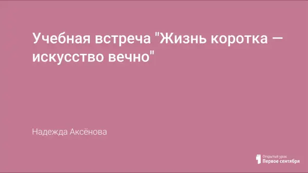 Учебная встреча "Жизнь коротка - искусство вечно" позволяет закрепить и проверить знания, полученные на уроках МХК и истории. Мероприятие даёт возможность проявить творчество и фантазию учащихся в разных видах искусства в период с древшейших времён до эпохи Просвещения. Сплотить класс при подготовке и проведения праздника, дать настрой на изучение следующей эпохи.