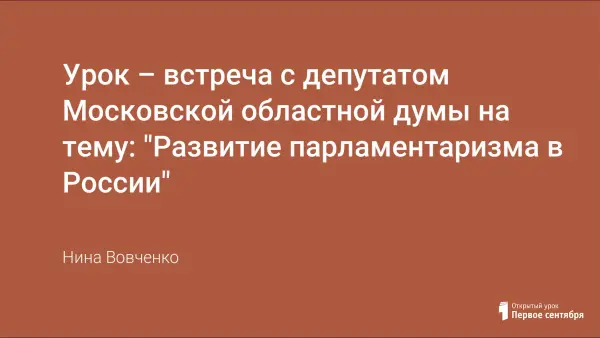 Урок осуществлен в рамках Всероссийского урока "Развитие демократии в России", посвященного 100-летию Государственной Думы. Он является составной частью изучения политико-правовой сферы. Задача урока – обобщить и закрепить основное понятие – "демократия", связав теоретические знания с практикой на примере Московской областной думы.