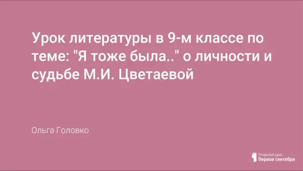 Поскольку ученики впервые встречаются с творчеством этого поэта, ведущей целью занятия является знакомство с личностью и судьбой Цветаевой, создание мотивации для дальнейшего изучения лирики Марины Ивановны, выяснение причины её трагического ухода из жизни. Урок иллюстрируется редкими фотографиями семьи Цветаевой, включает видеоклип (фрагмент из кинофильма "Ирония судьбы..." с исполнением романса М.Таривердиева на слова М.Цветаевой "Мне нравится, что вы больны не мной..."), строится на основе развивающей технологии встречных усилий, рассчитанной на сотворчество ученика и учителя.