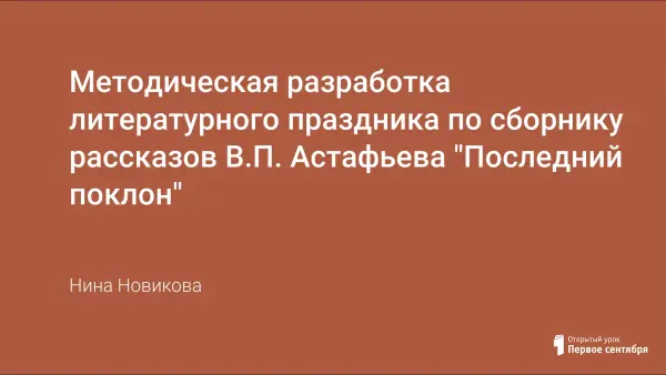 В разработке освещены основные этапы биографии В.П. Астафьева, составлены литературная викторина по рассказам, входящим в сборник "Последний поклон", инсценировка "За земляникой" по мотивам рассказов. Использован в качестве оформления интерьер, представляющий собой крестьянскую избу, репродукции с изображением картин сибирской природы. Продумано музыкальное сопровождение. Литературный праздник способствует развитию творческих способностей учащихся, помогает углубить интерес к литературе.
