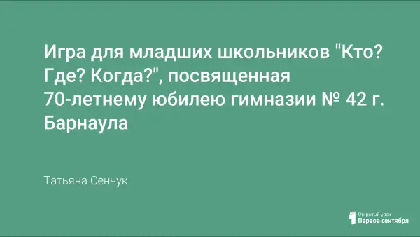 В статье представлен сценарий игры "Кто? Где? Когда?", посвящённой 70-летнему юбилею гимназии № 42 г. Барнаула. Эта игра позволяет в увлекательной форме познакомить младших школьников с историей и традициями гимназии, помогает объединить вокруг этого события людей нескольких поколений: современных гимназистов, их родителей – выпускников гимназии, преподавателей разных лет.