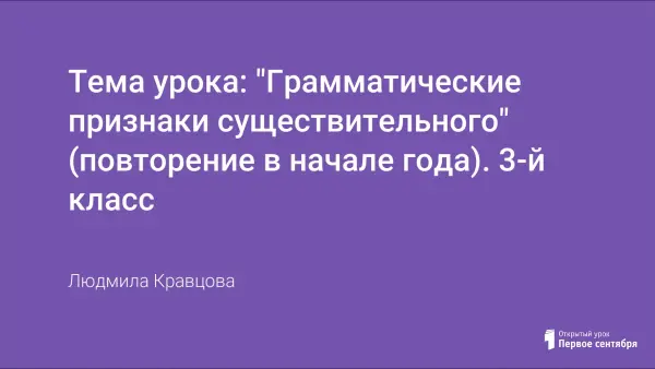 Предлагается урок русского языка в начальной школе. Урок ставит следующие цели: закрепить и систематизировать знания о грамматических признаках существительного; способствовать формированию навыков грамотного письма; развивать речь учащихся; углублять знания об имени существительном; способствовать воспитанию ответственного отношения к учению.