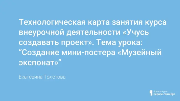 Методическая разработка представляет собой описание занятия курса внеурочной деятельности «Учусь создавать проект» для учащихся 3-го класса по теме «Создание мини-постера «Музейный экспонат». В ходе занятия учащиеся учатся мини-постер по проекту, формируется и развивается познавательный интерес к изучению истории России; уважительное отношение к историческому наследию. Место проведения урока: школьный музей. Учащиеся работают с экспонатами музея.