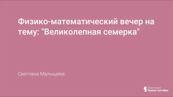 Физико-математический вечер в школе. Участники вечера - учащиеся 7–11-х классов. В ходе вечера 7 команд по 7 человек соревнуются за право называться Знатоками математики и физики. Вечер проводится в ходе Декады физико-математических наук. Заинтересовать учащихся математикой и физикой, раскрыть эти предметы с новой для учащихся стороны - главная цель вечера. В ходе групповой работы ученики разных классов ищут ответы на различные вопросы. Им предоставляется возможность и попеть, и поиграть, и посочинять стихи.
