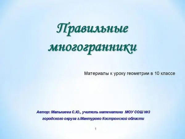 Данная статья содержит материал для учителя математики в помощь изучения темы "Правильные многогранники" в курсе геометрии 10-го класса. Статья снабжена презентациями по теме.
