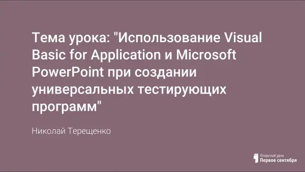 В данной работе описывается процедура создания тестирующих программ, предназначенных для контроля знаний в определенной предметной области. Используемые средства реализации: объекты PowerPoint, программируемые элементы управления, процедуры обработки их состояния, написанные на языке программирования VBA. Проект рассчитан на блок занятий.