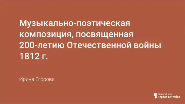В работе проведена разработка урока, посвященного 200-летию Отечественной войны 1812 года в форме музыкально-поэтической композиции. Урок призван закрепить в нестандартной форме материал по истории наполеоновского нашествия. Урок может проводиться как в классе, так и в актовом зале школы. С привлечением гитариста-аккомпаниатора ученики читают стихи Пушкина, Лермонтова, Глинки, Давыдова и поют песни на стихи Цветаевой, Окуджавы, Кима, Берковского и Гладкова.
