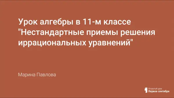 Урок алгебры "Нестандартные приемы решения иррациональных уравнений" может проводиться как урок обобщения знаний в 11-м классе при подготовке к экзамену или как урок в сильном 10-м классе при изучении темы иррациональные уравнения (§ 9 в учебнике "Алгебра и начала анализа" Алимов Ш.А. и др). Рассмотрены примеры решения уравнений, собранных из материалов вступительных экзаменов в различные ВУЗы г. Санкт-Петербурга.