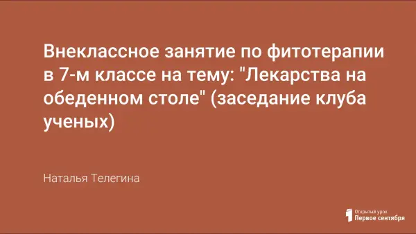 Представлены программа и методическая пособие "Фитотерапия" - элективный курс для учащихся 7-8-х классов (68 часов). Данное мероприятие проводится в теме "Пища должна быть лекарством". На него мы приглашаем ребят младших классов. К сценарию внеклассного мероприятия "Лекарства на обеденном столе" прилагаются статьи из газет, фотографии.