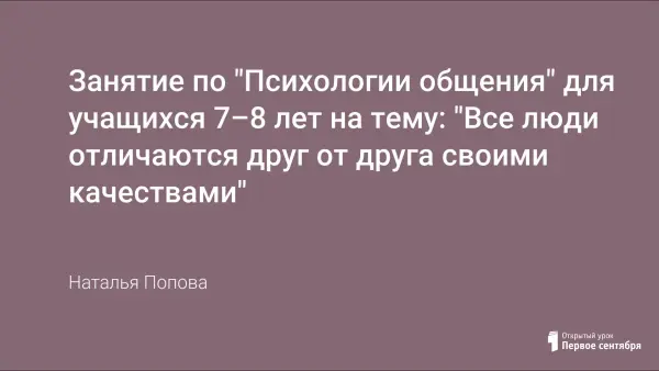 «Мы часто встречаем разных людей, кто-то из них похож на нас, кто-то отличается, кто-то кажется нам необычным и даже странным. И все мы по-разному воспринимаем и относимся к тем, кто не такой, как мы. Цели представленного занятия: закрепить знания учащихся о положительных и отрицательных качествах характера человека, научить детей определять достоинства и недостатки себя и других людей, понимать их причины, помочь детям поделиться своими представлениями о себе, показать, что у каждого есть свои таланты и способности, которые делают нас особенными, непохожими на других».