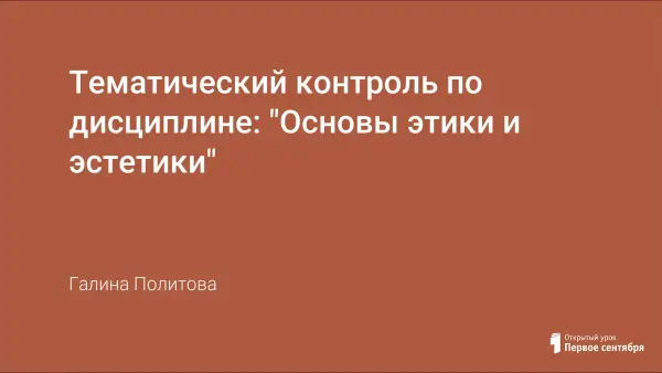 Тематический контроль по дисциплине "Основы этики и эстетики" предназначен для проверки знаний студентов второго курса СПО. Контроль состоит из двух блоков: блок А - проверка теоретического материала; блок Б - вопросы и задания, носящие личностный характер и ориентированные на возможность индивидуального этического толкования.