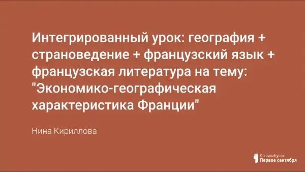 Идею проведения этого урока подали сами учащиеся, которые, побывав со школьным театром во Франции, предложили рассказать о "своей" Франции во время изучения курса географии. Урок интегрирован с несколькими школьными дисциплинами: география, французская литература, французский язык, страноведение. Урок спаренный. Подготовительный этап отнял много времени, но вызвал большой интерес учащихся и позволил им применить свои навыки, полученные на уроках французского языка.