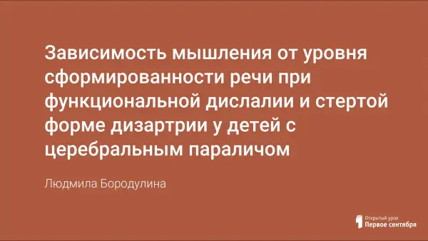 С целью эффективной коррекции недостатков речи у детей с детским церебральным параличом возникла необходимость исследования зависимости мышления и речи при функциональной дислалии и стертой формой дизартрии. Исследование мышления показало, что при стертой дизартрии задерживается темп психического развития ребенка, что требует активного медико-педагогического воздействия.