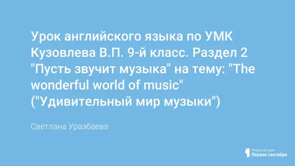 Урок английского языка по теме "The wonderful world of music" ("Удивительный мир музыки". 9-й класс. Раздел 2 "Let the music begin" ("Пусть звучит музыка")) по УМК Кузовлева В.П. Данный урок является одним из завершающих уроков раздела "Пусть звучит музыка". Урок способствует расширению знаний учащихся по теме "Музыка", развитию творческих способностей, которые заключаются в самостоятельной подготовке учащимися сообщений о любимых стилях музыки и в умении выразить свое мнение и логически его изложить. На этом уроке совершенствуются навыки аудирования и монологической речи учащихся.