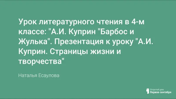 Урок для работы с учащимися 4-го класса. В начале урока можно использовать презентации «Страницы жизни и творчества. А.И. Куприн» как момент актуализации знаний и как «мостик» к изучению нового произведения данного писателя. Знакомясь с рассказом Куприна, учащиеся закрепляют умения работать с текстом: анализировать поступки героев, выявлять и формулировать основную идею произведения, осознавать свои чувства, сопереживать героям произведения.